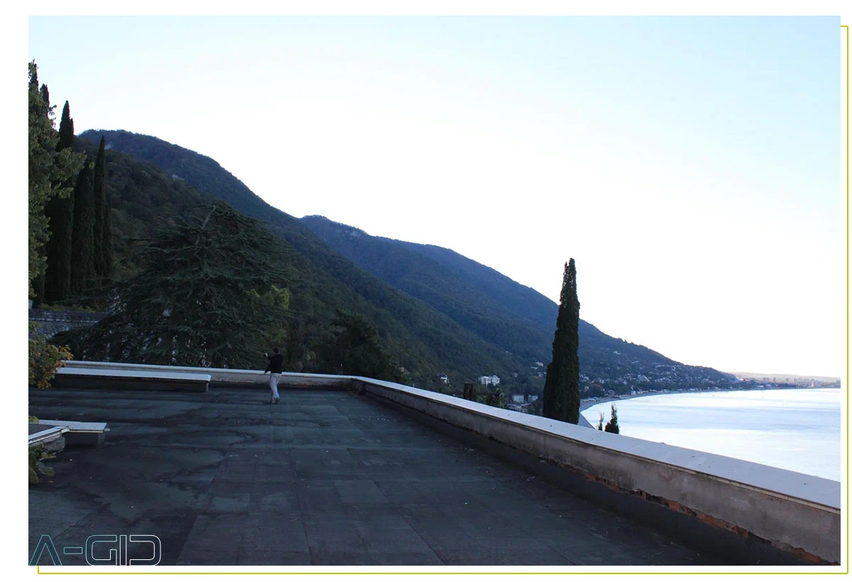 От террасы пансионата Скала открывается завораживающий вид на Гагру, море и лесистые склоны. Этот ракурс — мечта фотографов: арки и лестницы здания, склон, уходящий к морю, отражаются в кадре. Особенно эффектно вечером, когда солнце садится над горизонтом и окрашивает море в тёплые тона. Здесь можно сделать кадры, которые запомнятся, и почувствовать себя частью истории курорта.